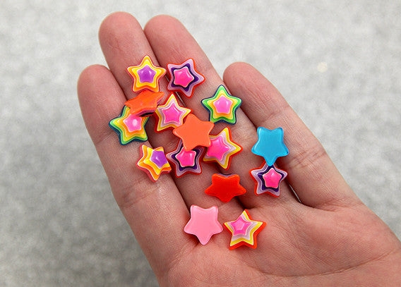 Star Flat Backs - 13mm Tiny Bright Striped Neon Rainbow Stars Resin Cabochons - 16 pc set