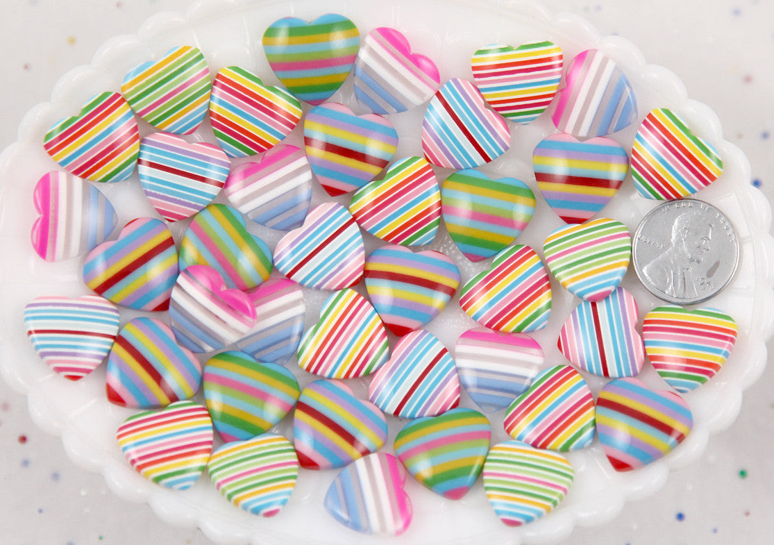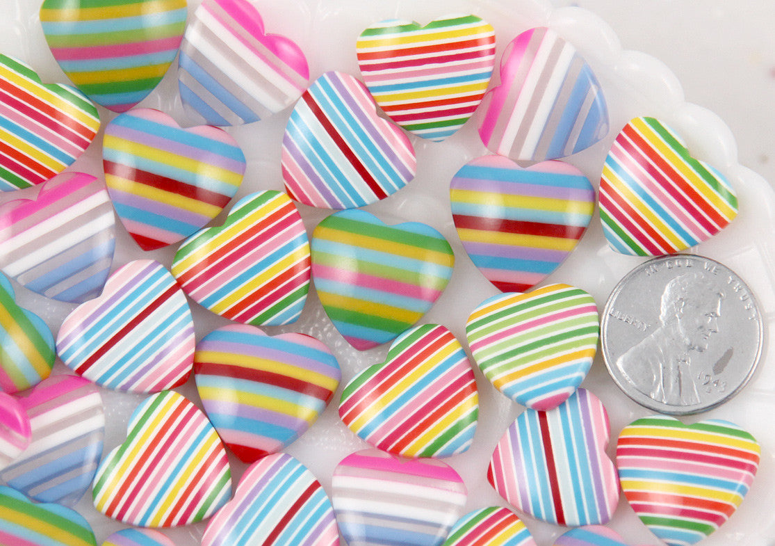 17mm Colorful Rainbow Striped Hearts Resin Flatback Cabochons - 12 pc set