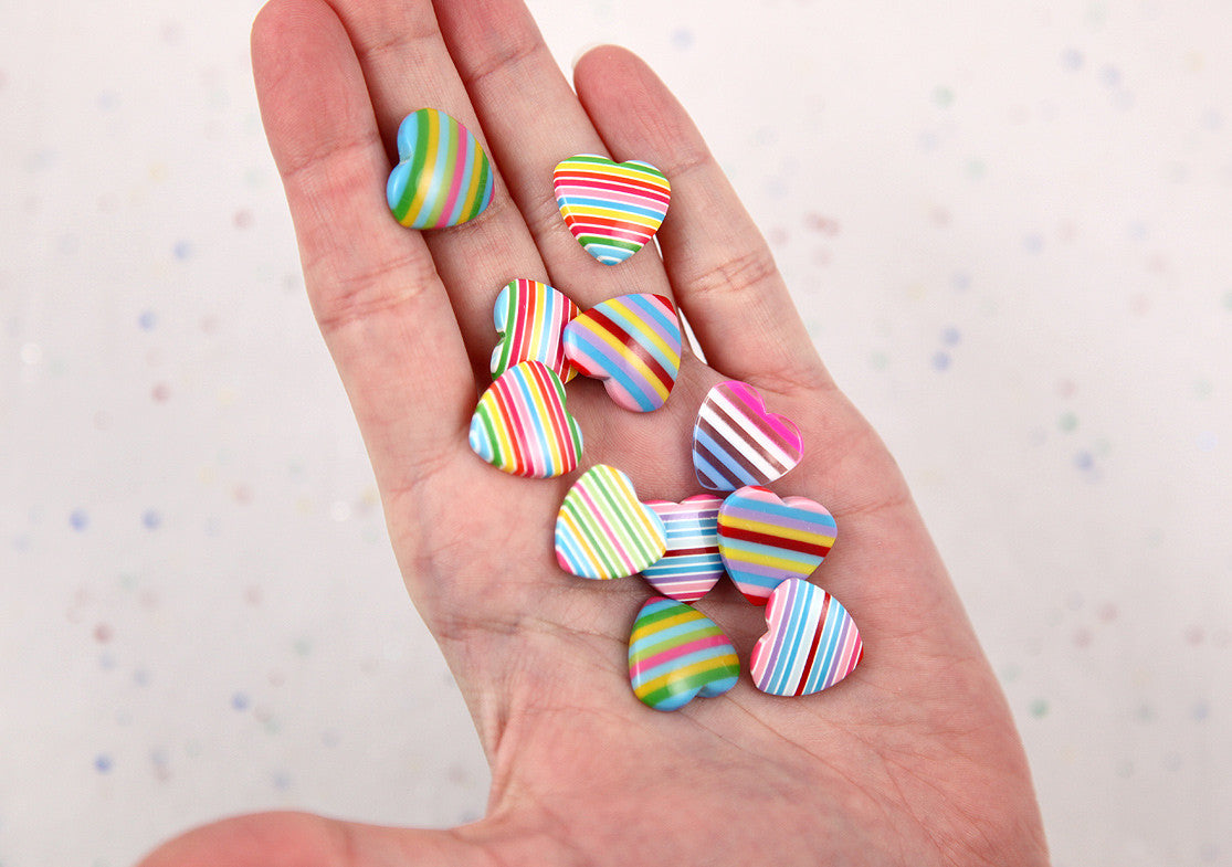 Amazingly cute little hearts with multi-colored bright stripes embedded within. Great for making into earrings, charms, or use them in your decoden projects!