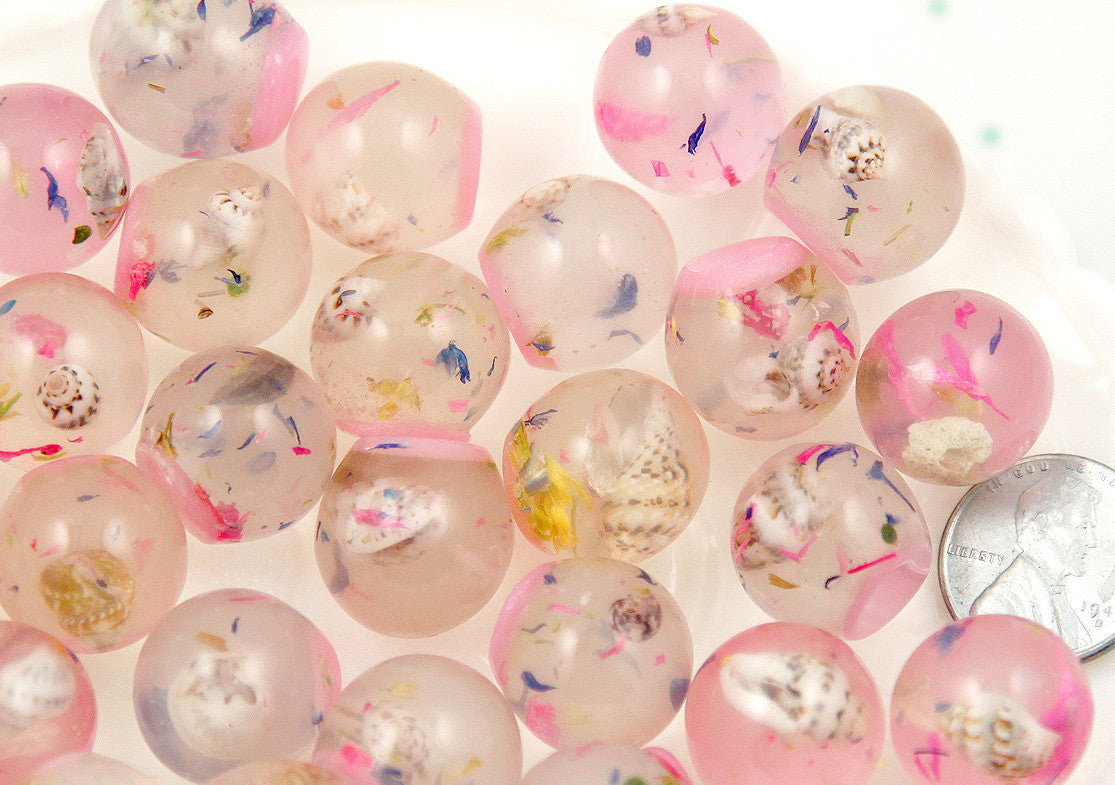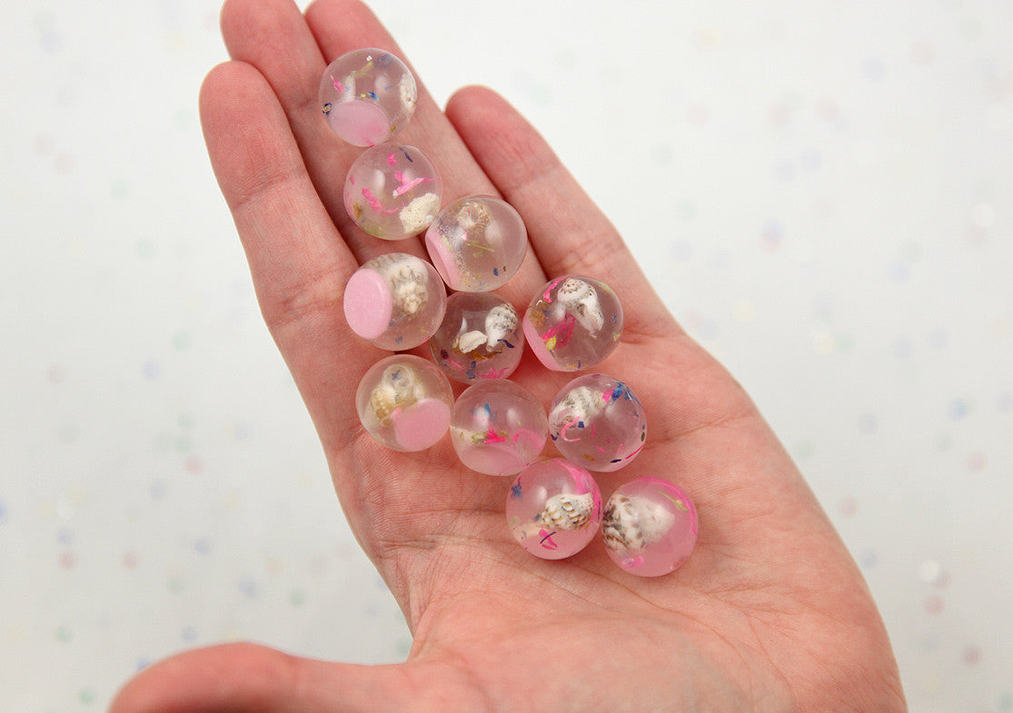 These amazing little resin globes have tiny seashells, flower petals and colorful confetti embedded inside. They do not have holes drilled - they are flat on one side to easily attach them to rings, hairclips, earrings and decoden designs.