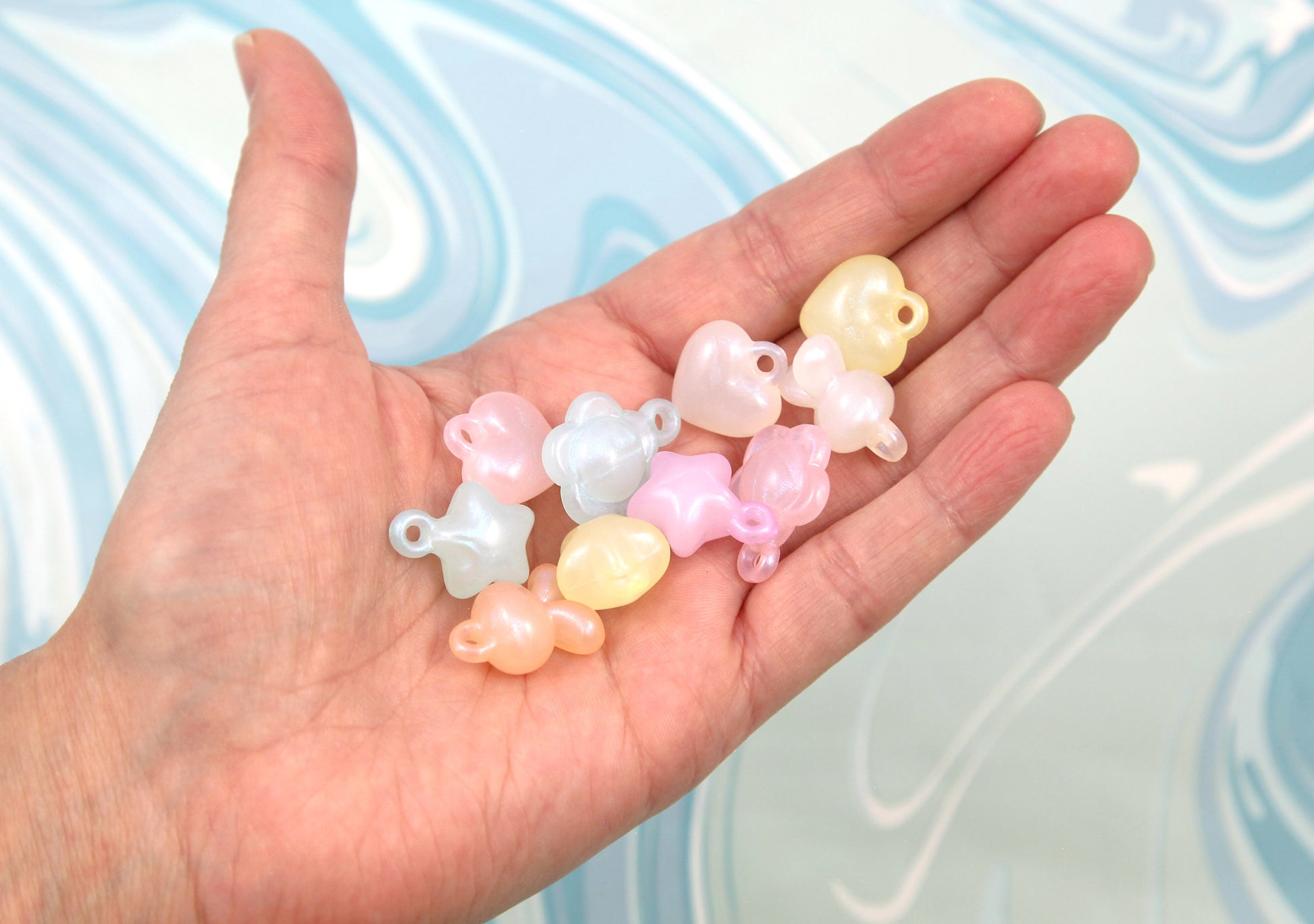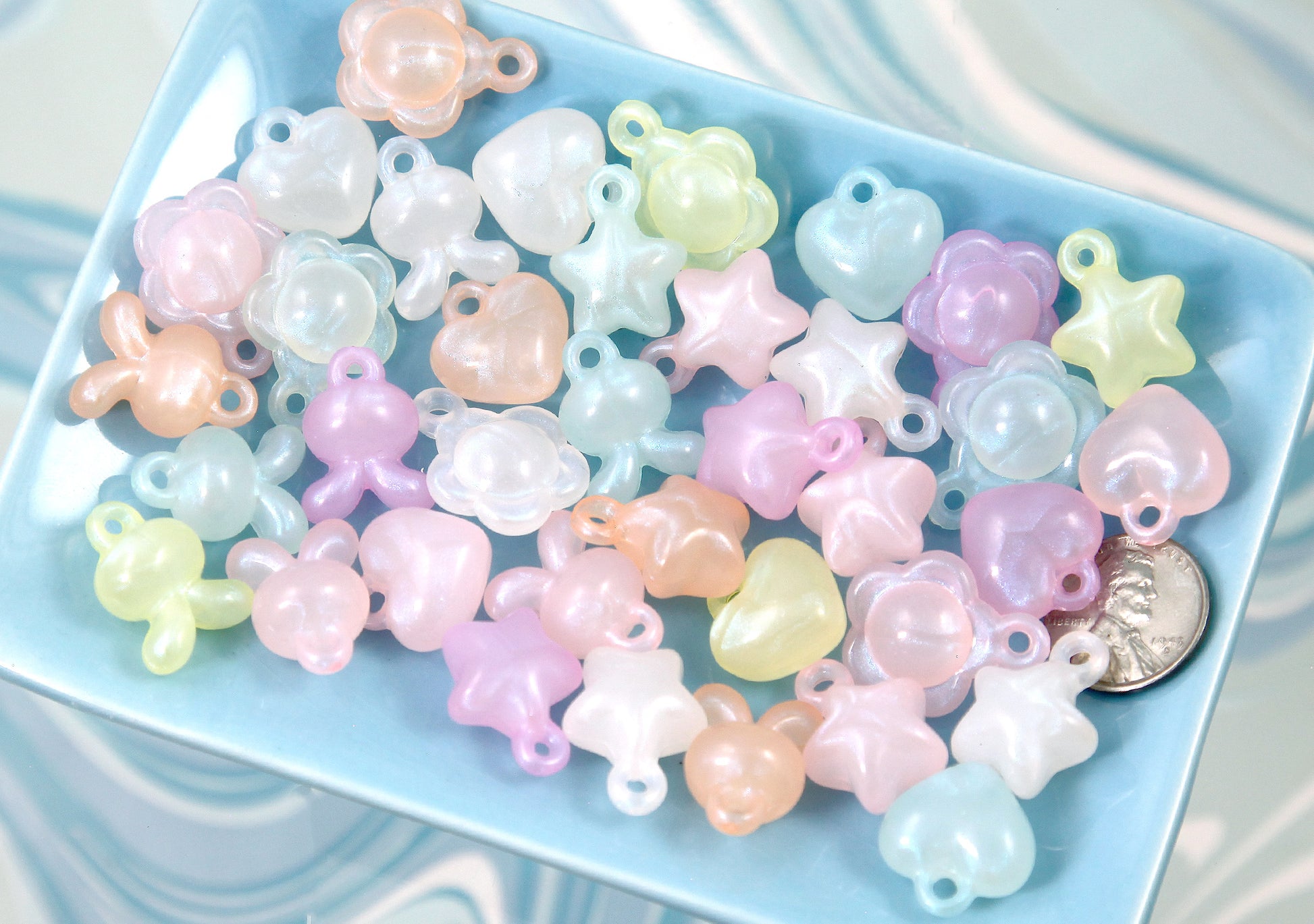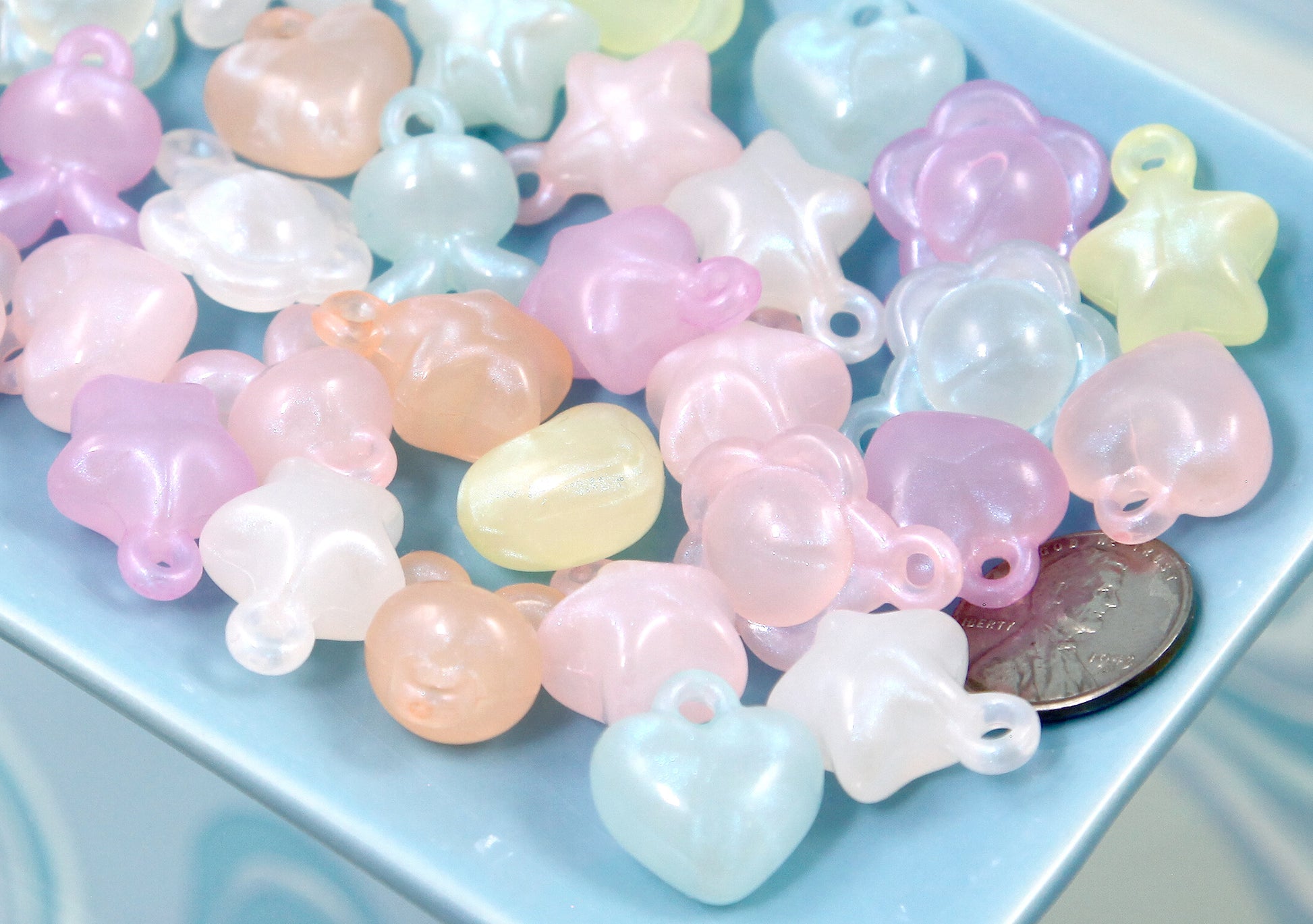Pastel Shimmer Charms - 40 pieces - Glow in the Dark! - 15mm Cute 3D Shapes Acrylic or Resin Charms - Cute Plastic Charms