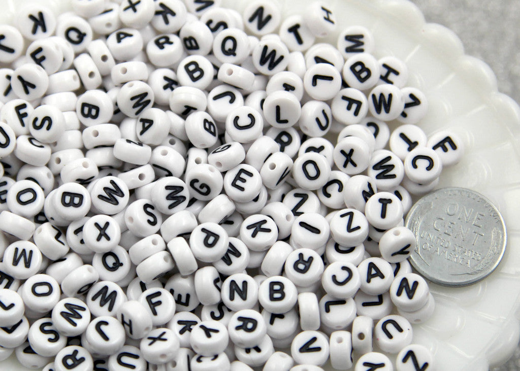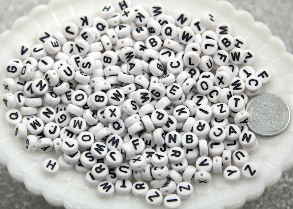 Darling little letter beads that you can use for so many creative projects. These beads have black letters on a white background.