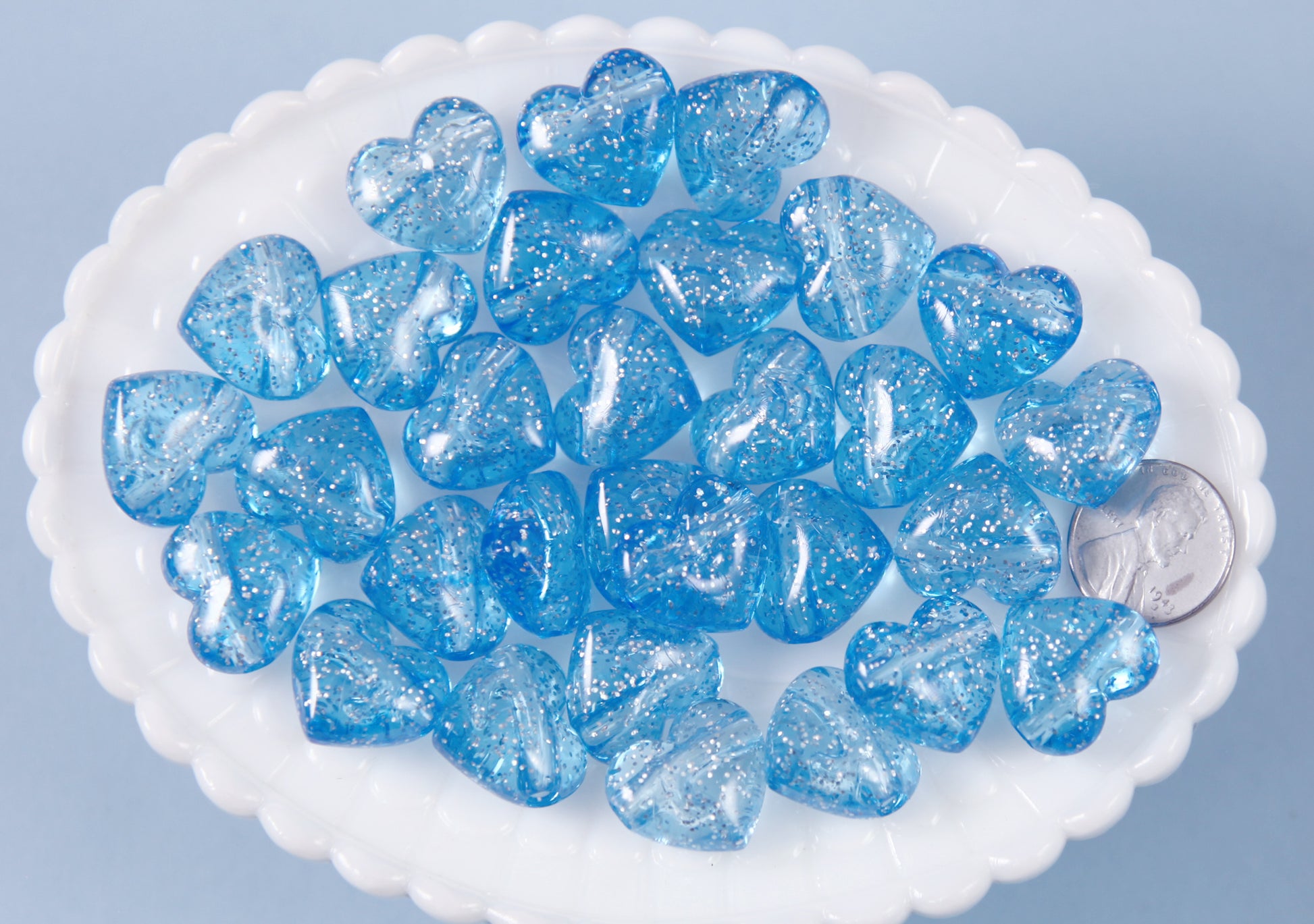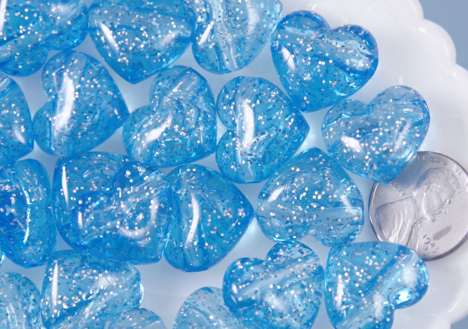 Blue Heart Beads - 18mm Blue Glitter Puffy Heart Acrylic or Resin Beads - 25 pcs set
