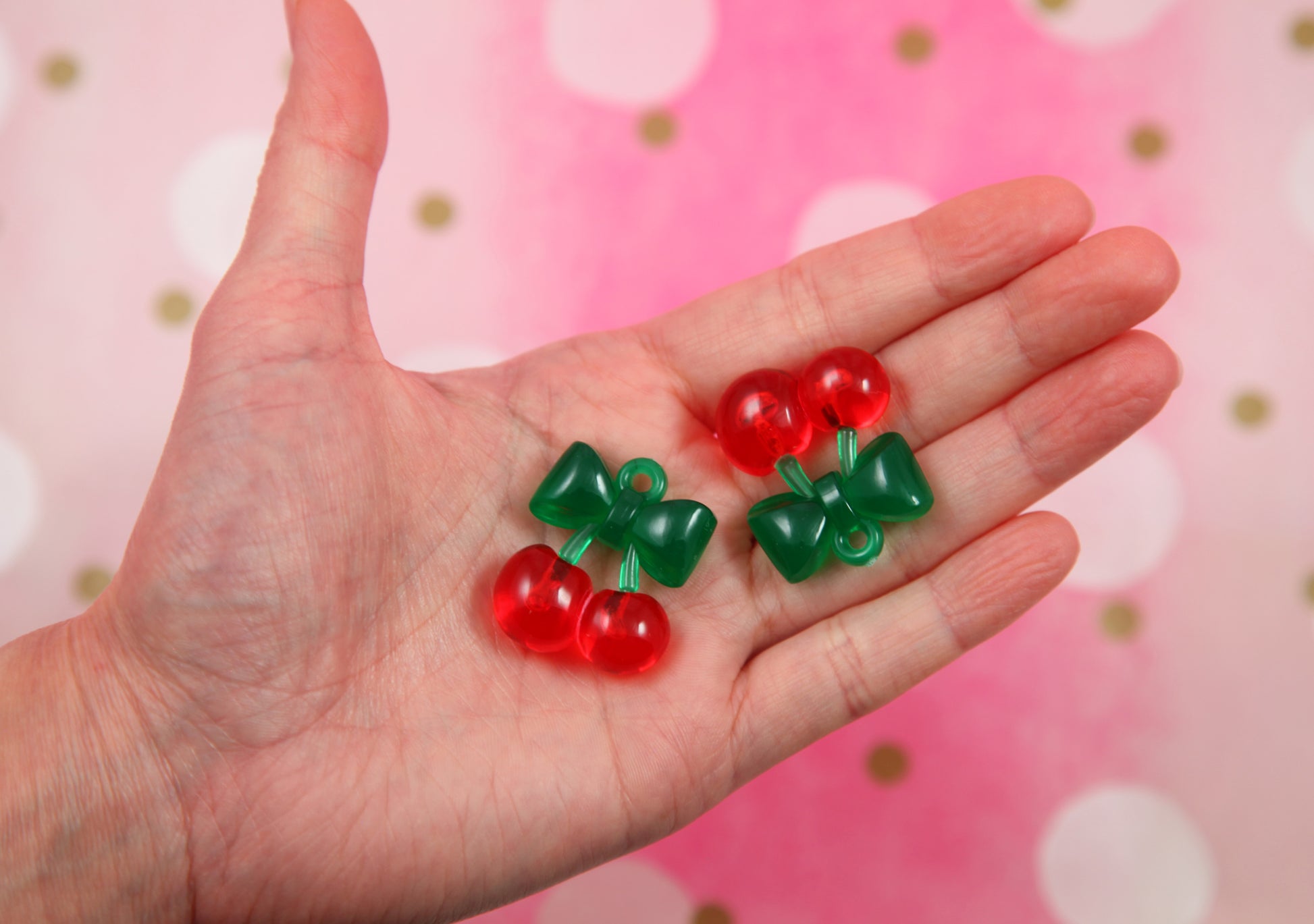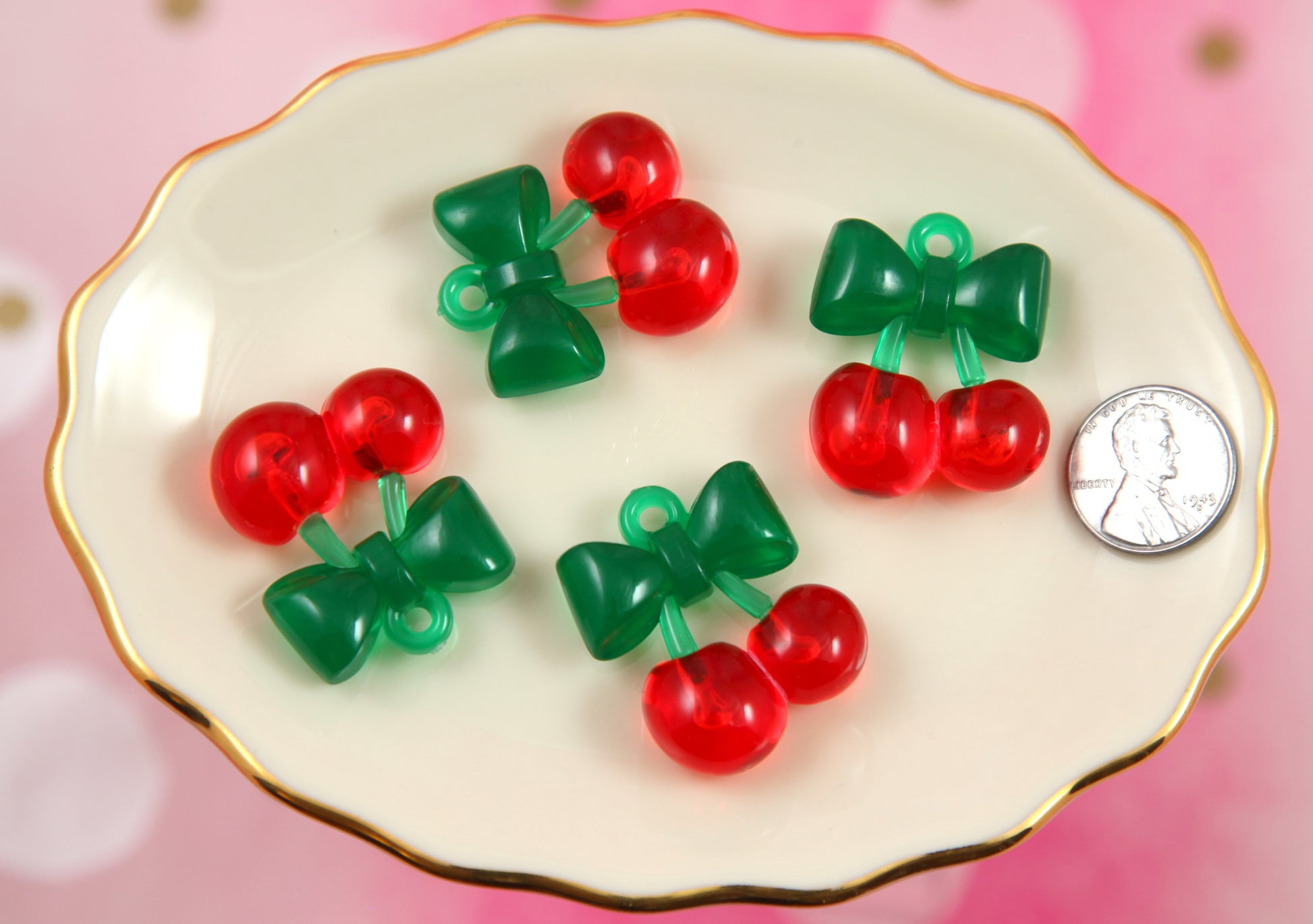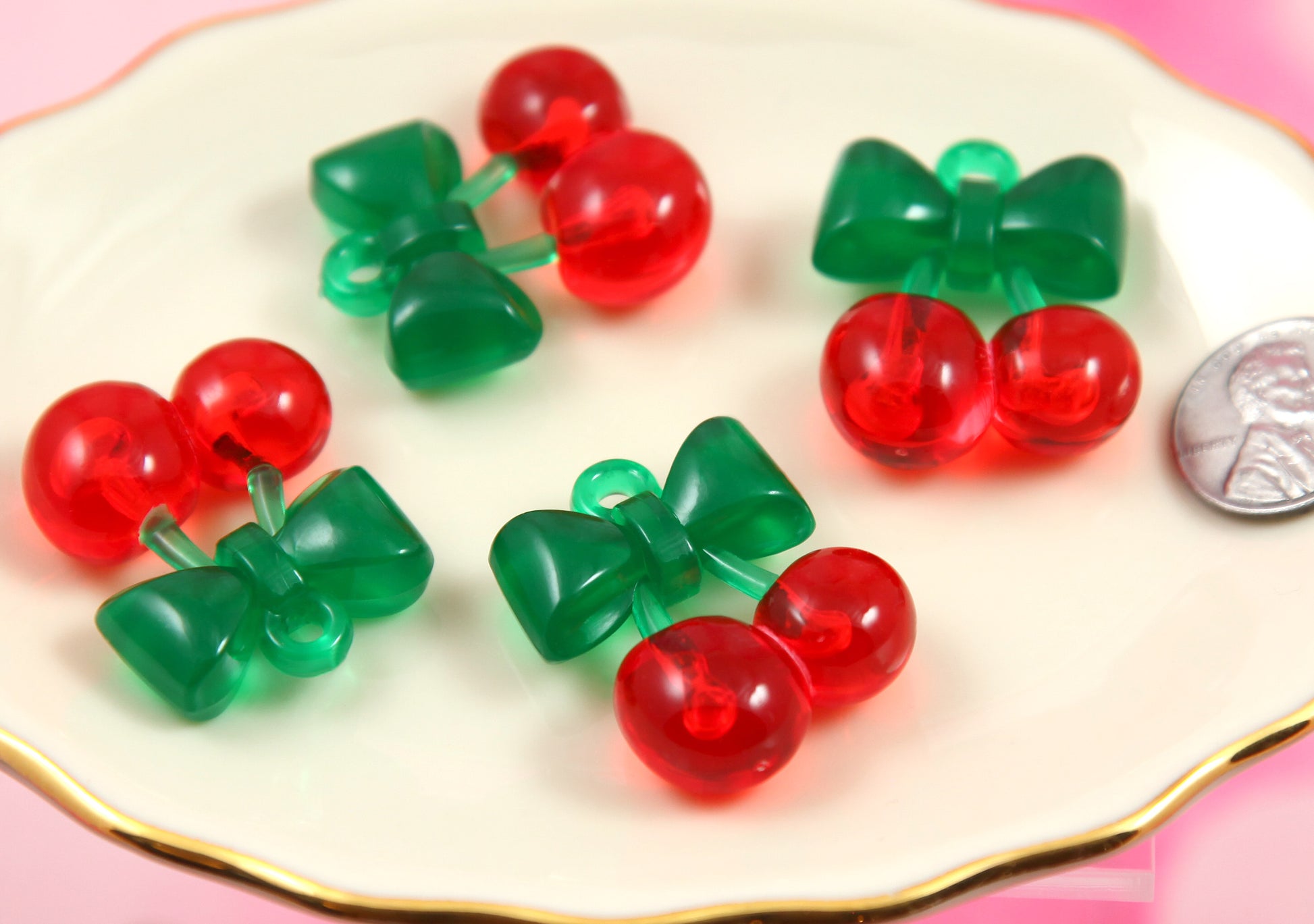 Cherry Charms - 6 pieces - 31mm Red Cherries with Bow Stem Fake Fruit Charm Cherry Plastic Pendants