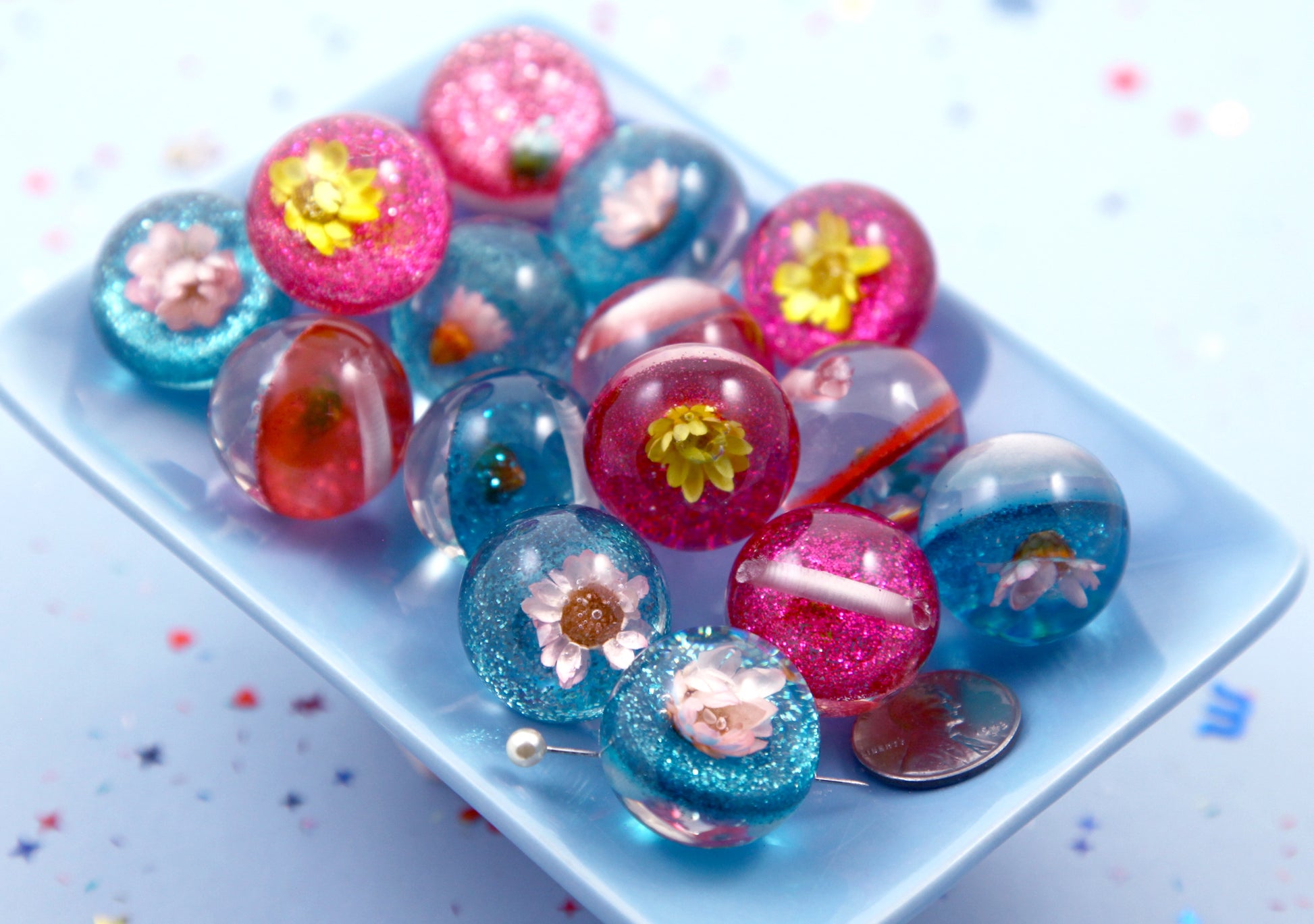 These super high-quality resin beads are inlaid with glitter and dried flowers. Use these amazing beads to add unique style to your jewelry designs.