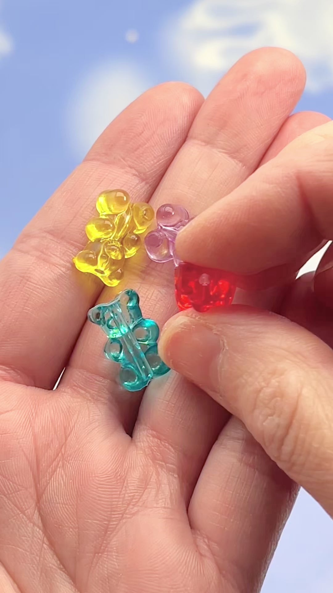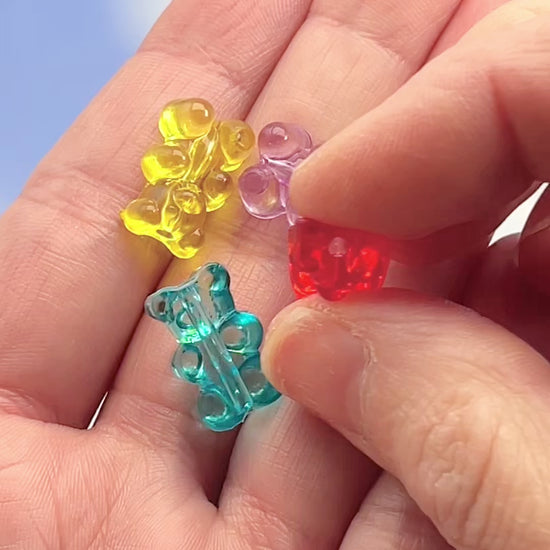 Realistic-looking gummy bear beads to make your craft projects cute! They are made of a hard plastic material. They have a hole drilled so you can string them as beads.
