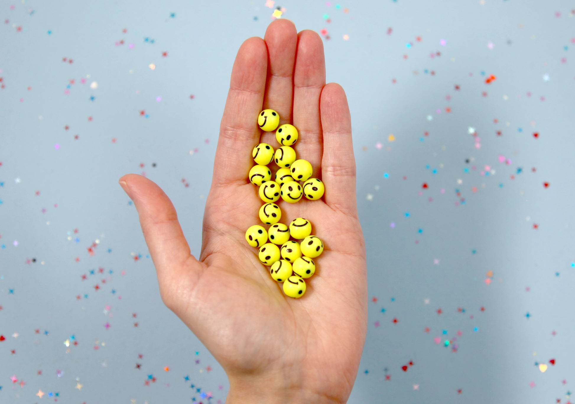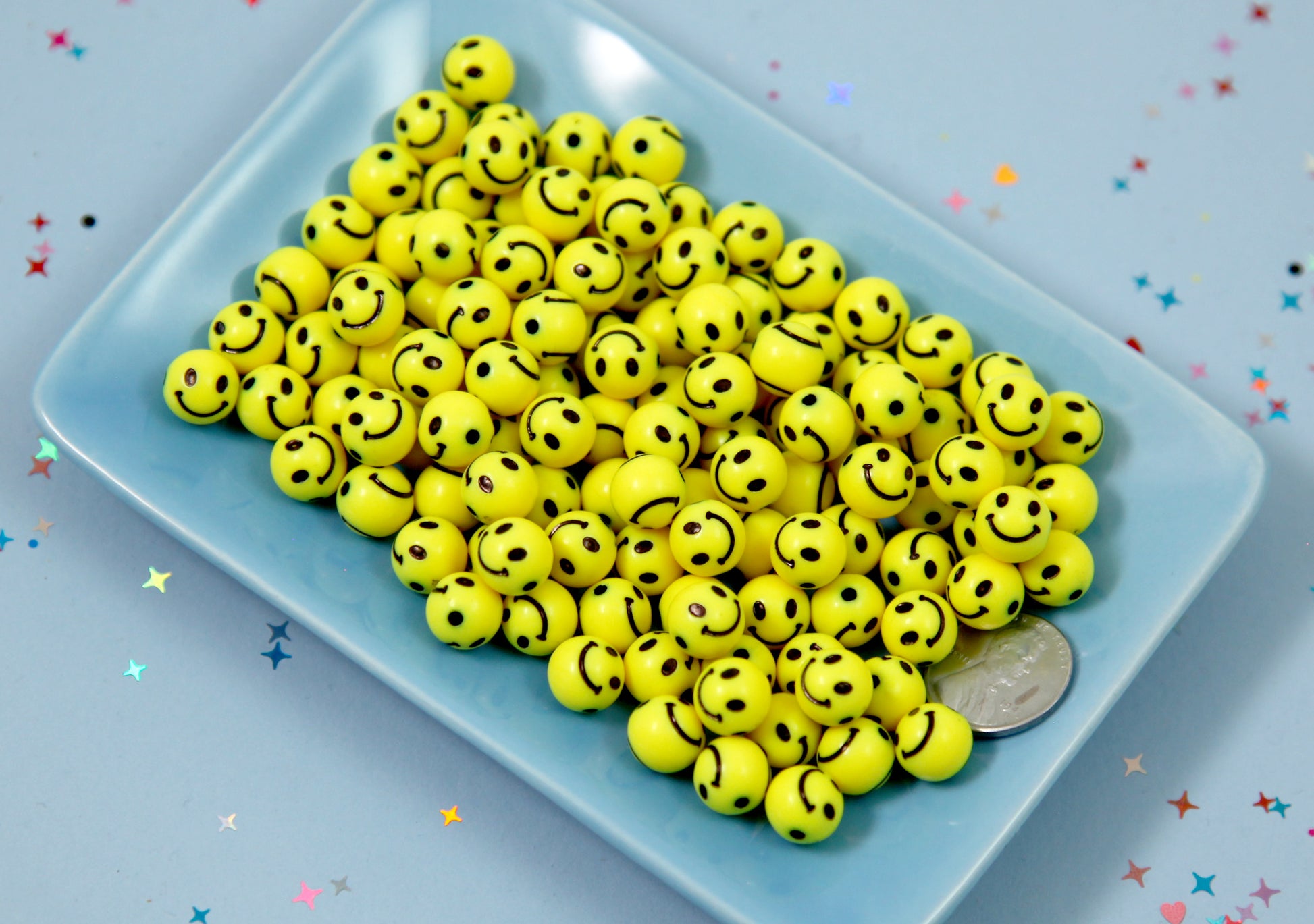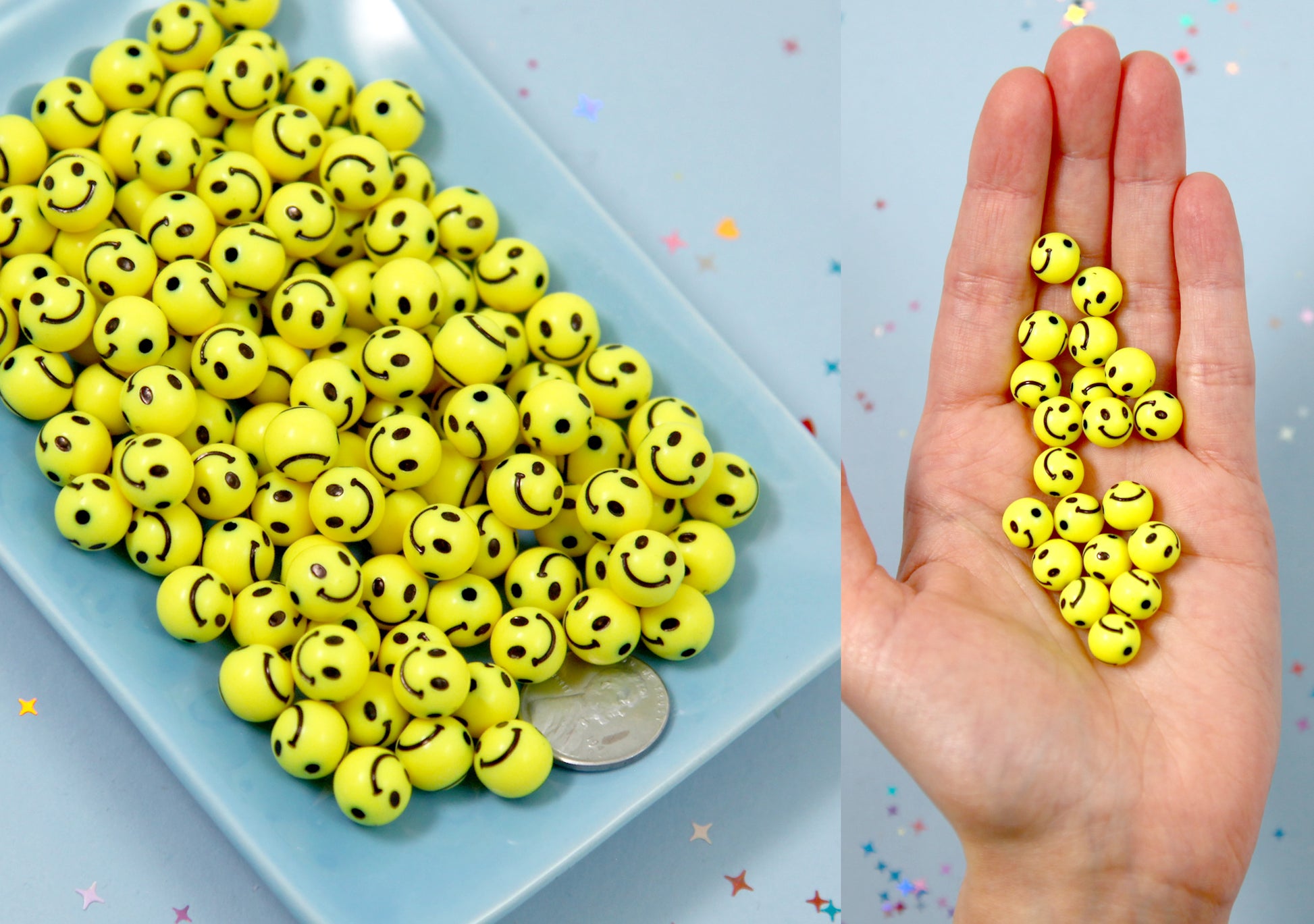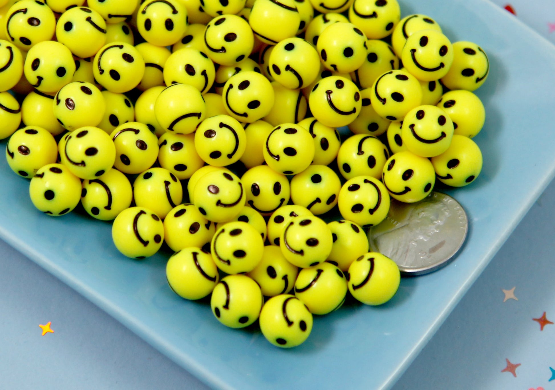 Cute round smiley face beads that you can use to make any kind of jewelry. They already have a hole drilled, so you can easily use them to make bracelets, necklaces, phone charms, earrings, etc.