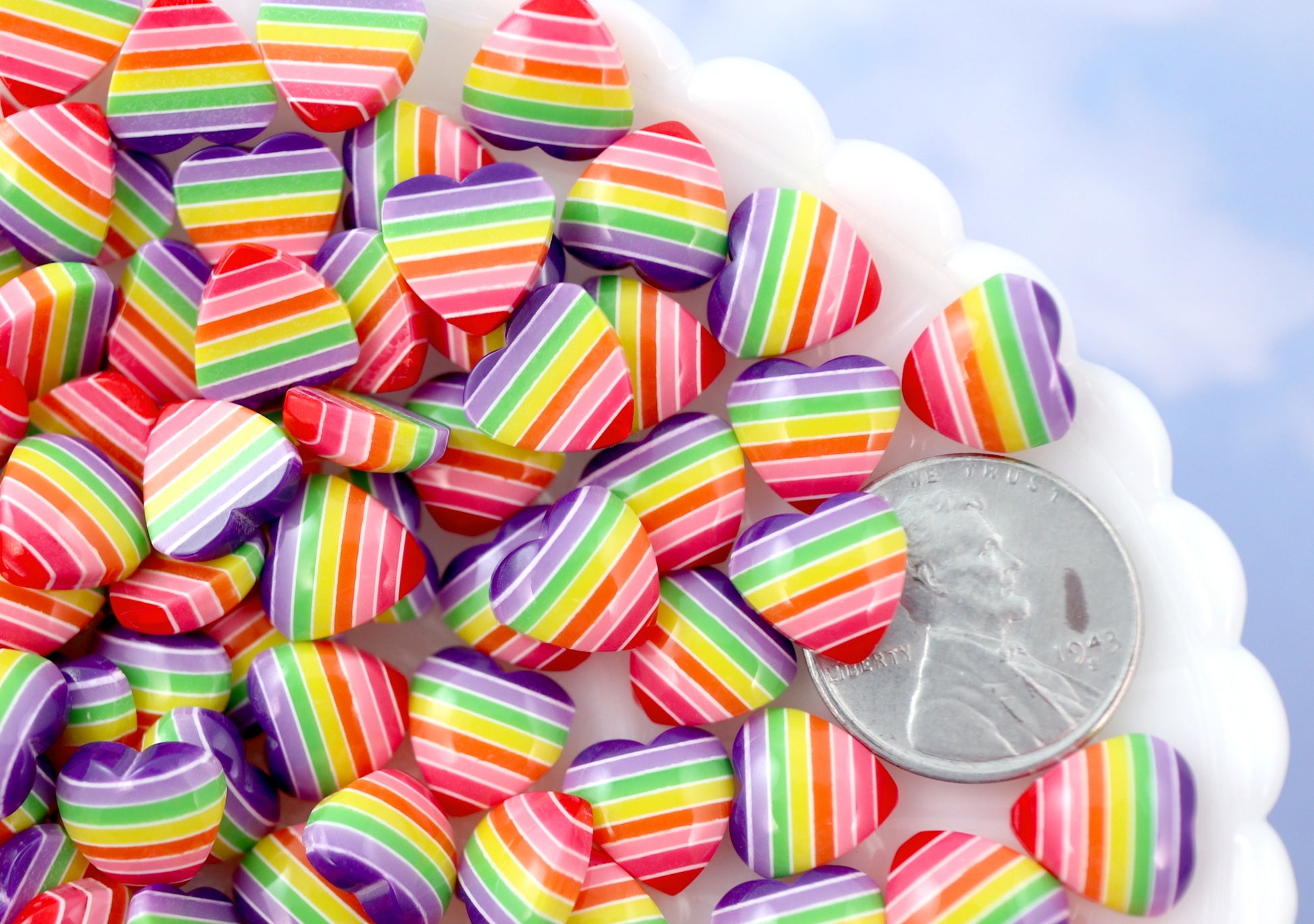 Amazingly cute little hearts with multi-colored bright stripes embedded within. Great for making stud earrings, or use them in your decoden projects!