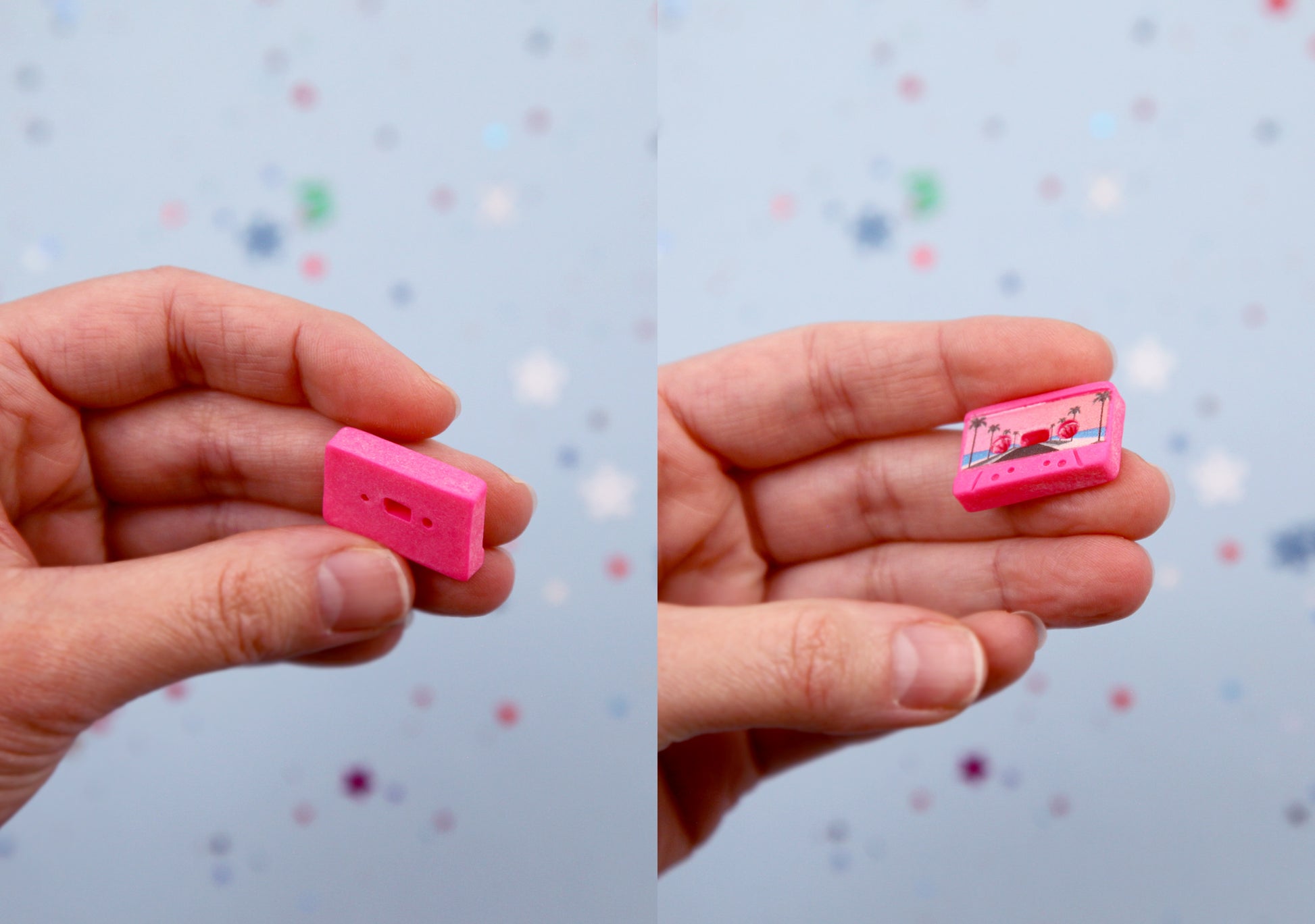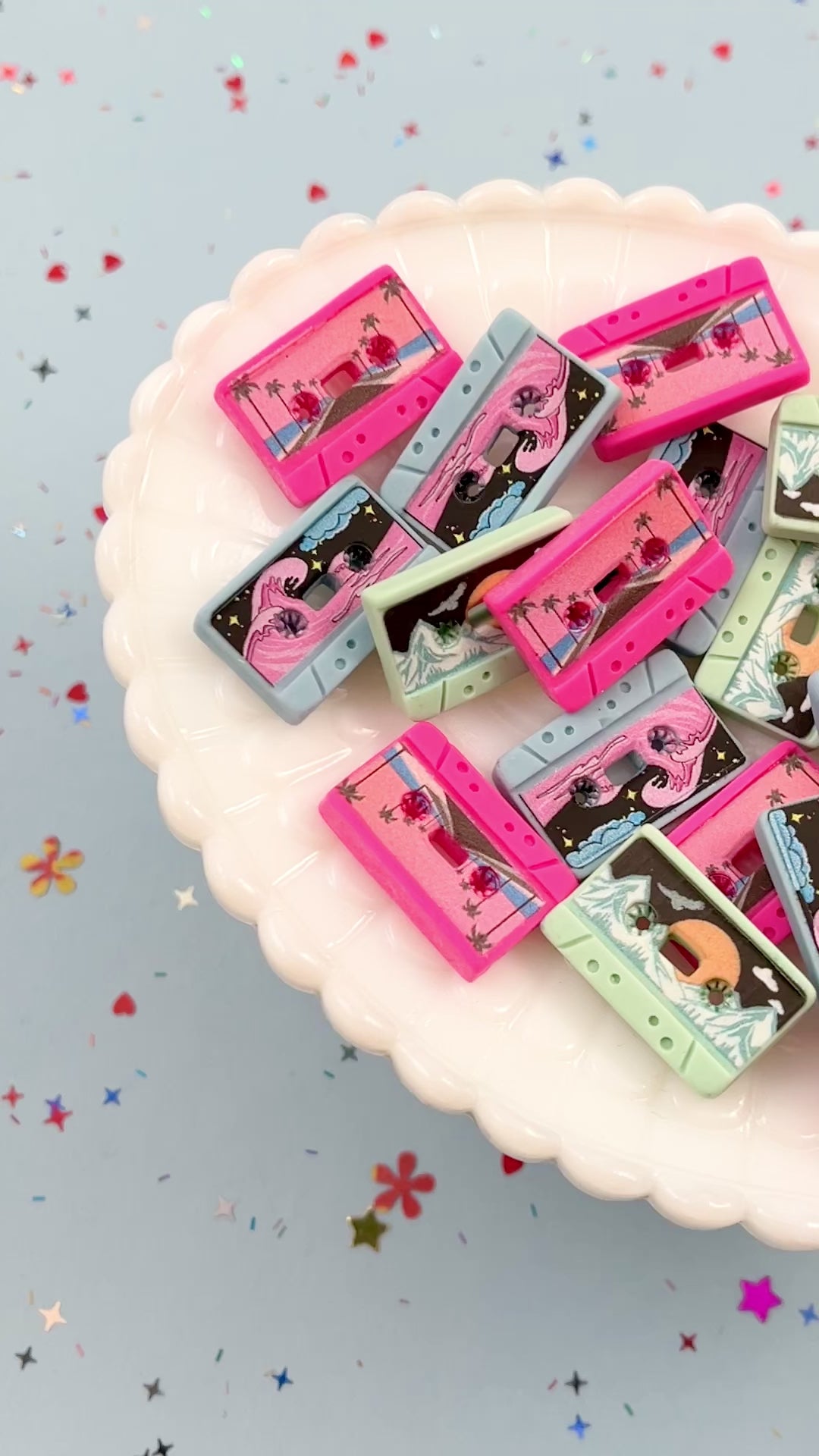 These cute fake cassette tape flatbacks are fun to attach onto any surface, make into jewelry, or decorate anything you like. These do not have holes - add a plastic bail or screw eye to turn them into charms.
