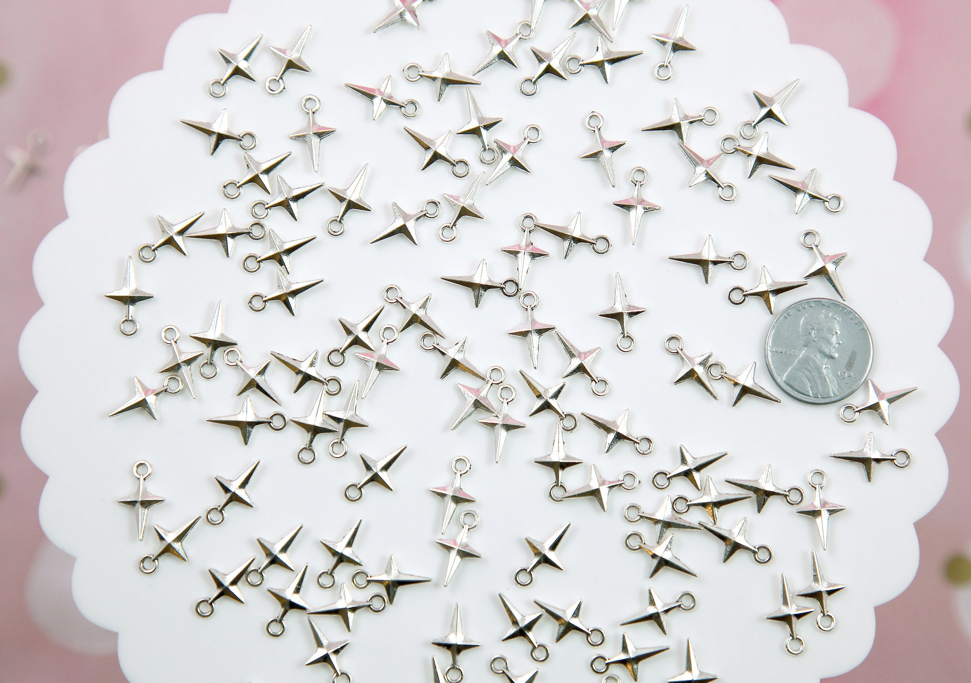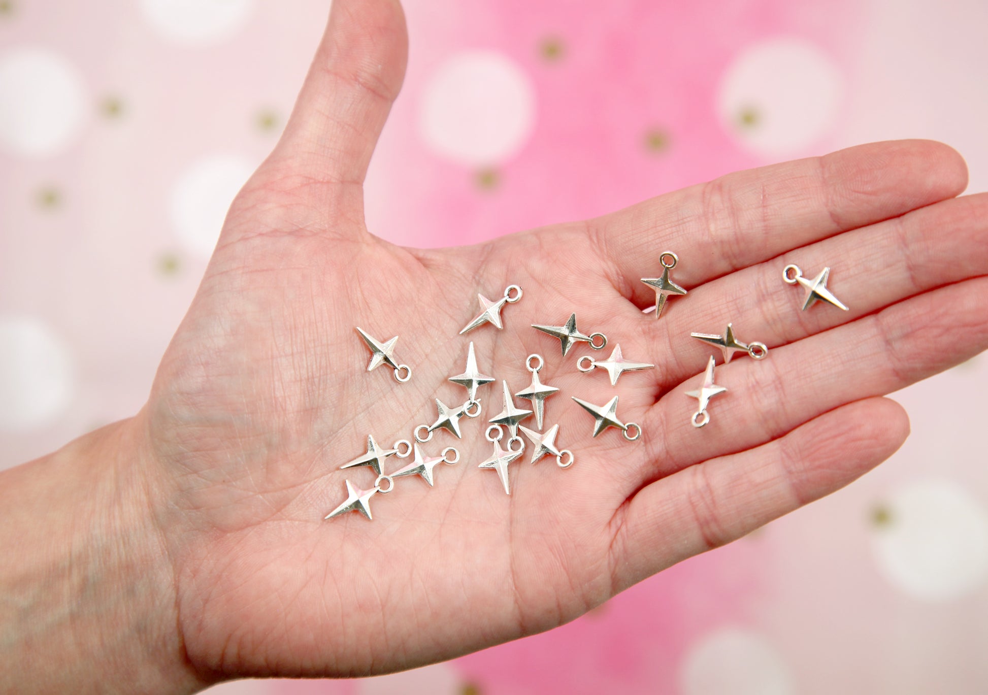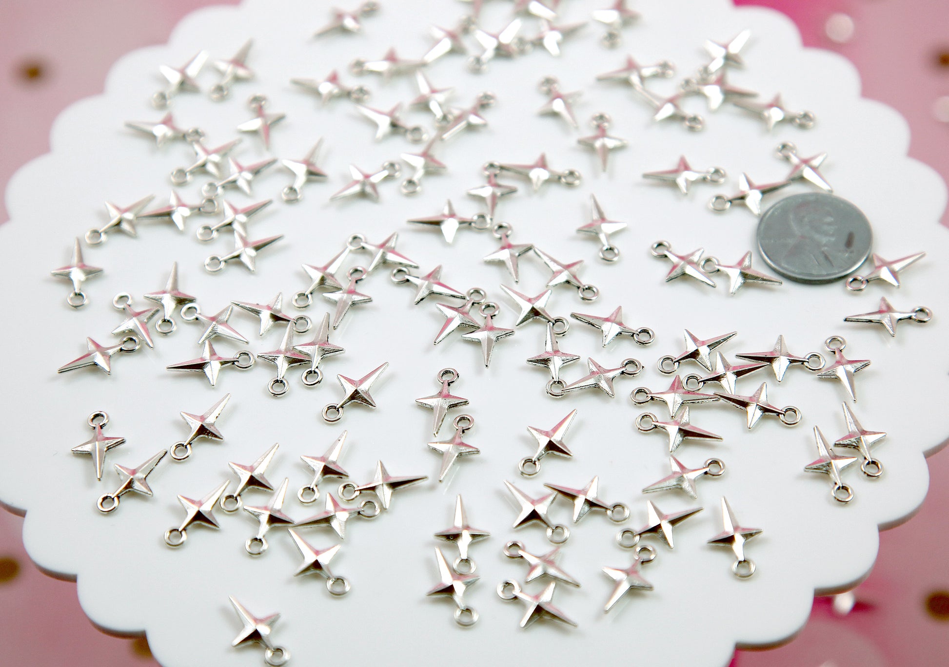 Tiny Four Pointed Star Charms - 50 pieces - Silver Color - 14mm Mini Stars Pendants Alloy Metal Charms