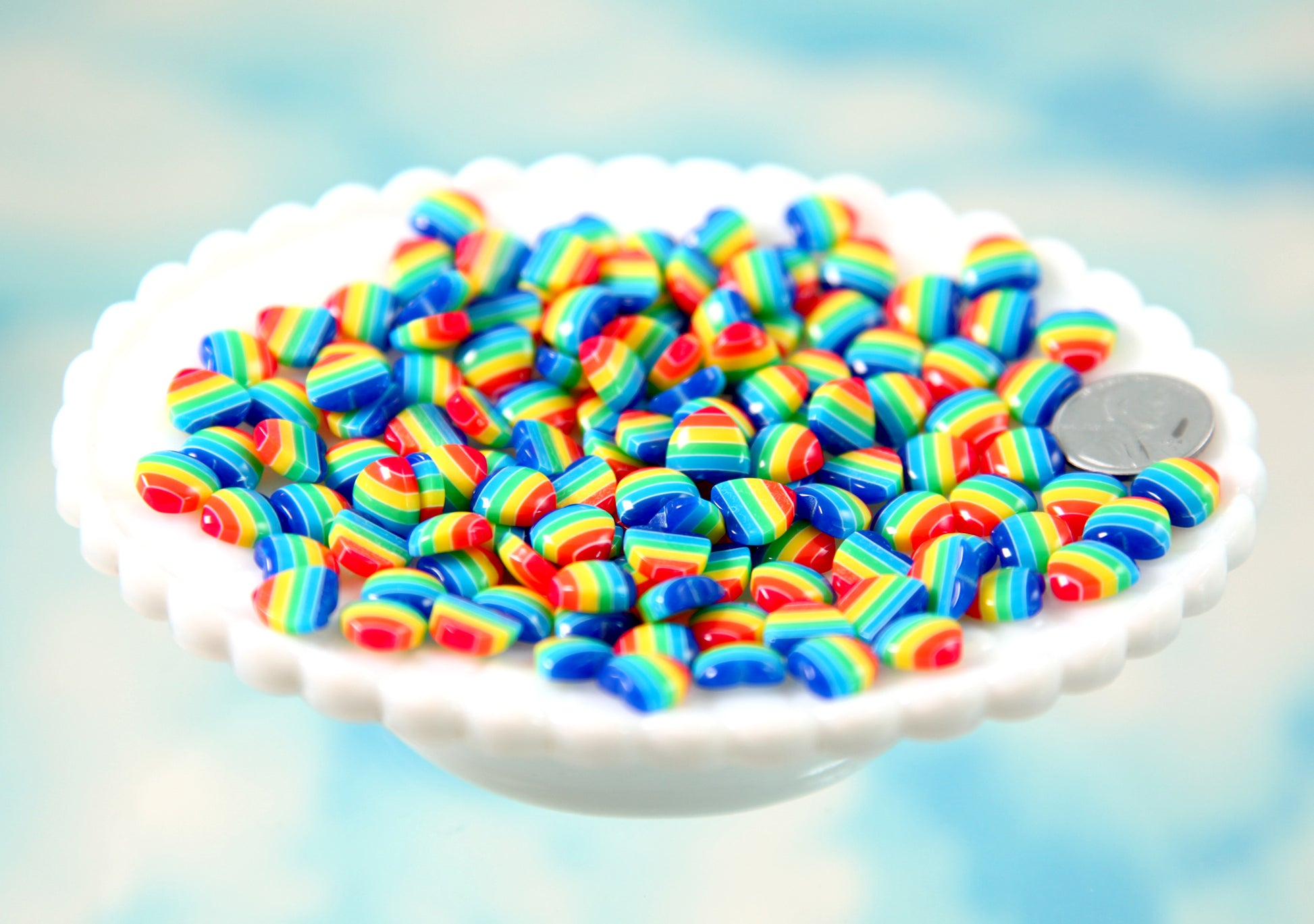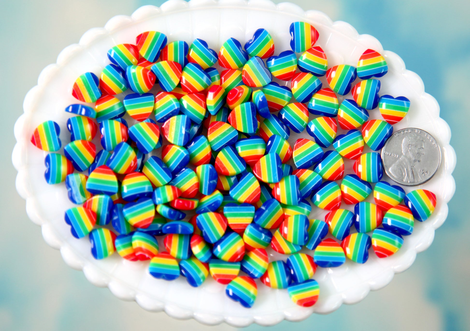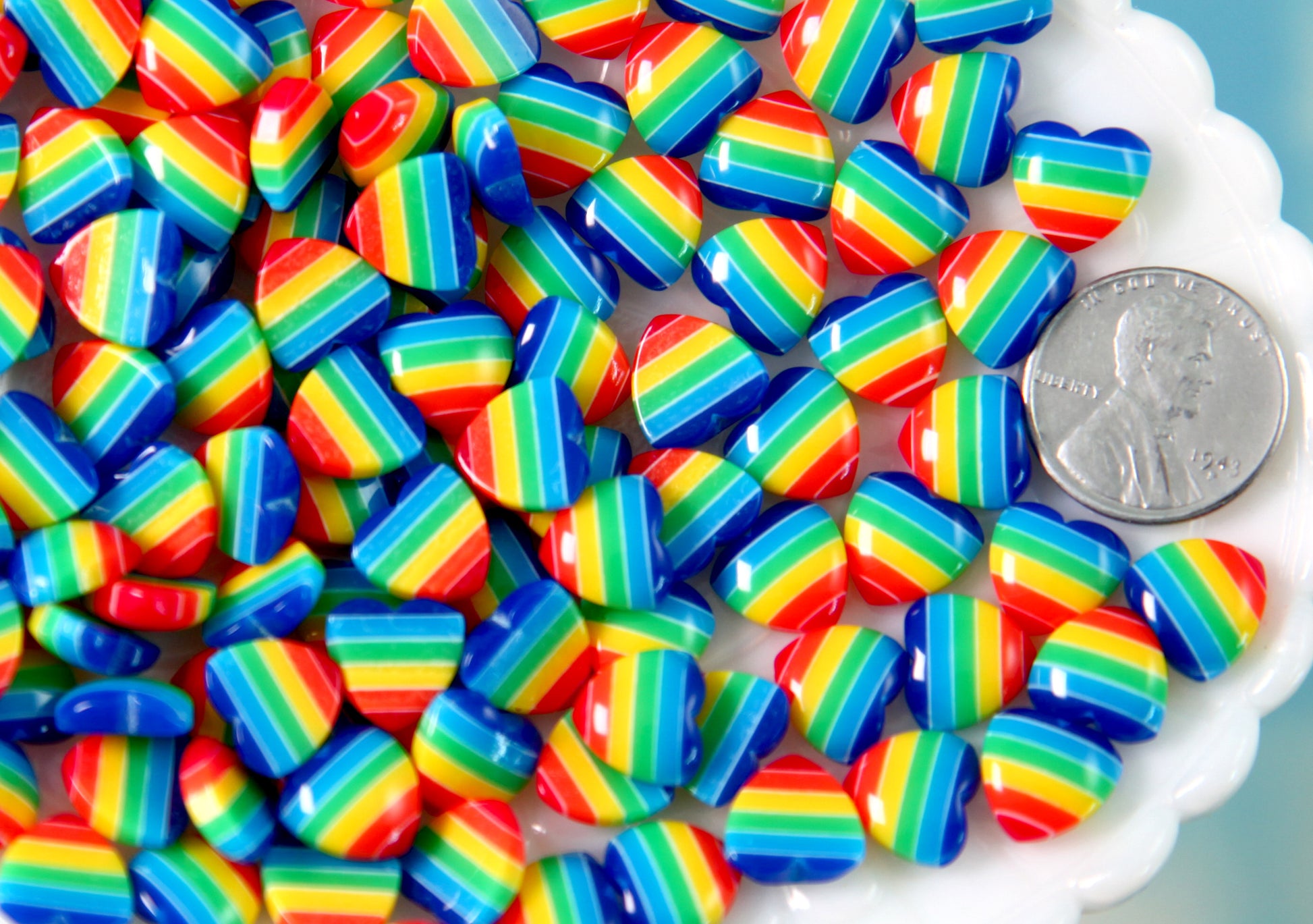 Tiny Rainbow Hearts - 10mm Tiny Classic Rainbow Striped Hearts Resin Flatback Cabochons - 12...