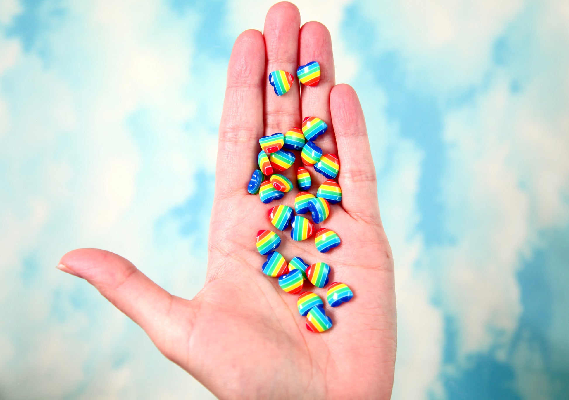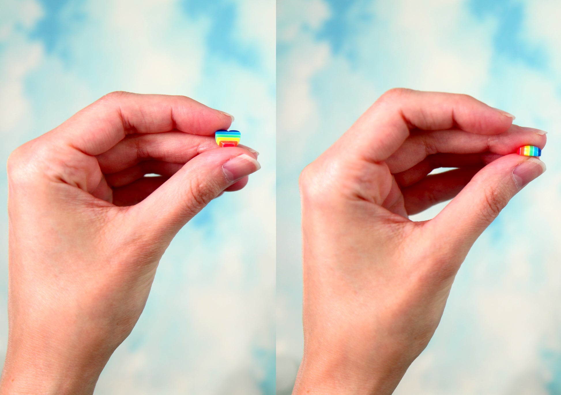 Amazingly cute little hearts with multi-colored bright stripes embedded within. Great for making stud earrings, or use them in your decoden projects!